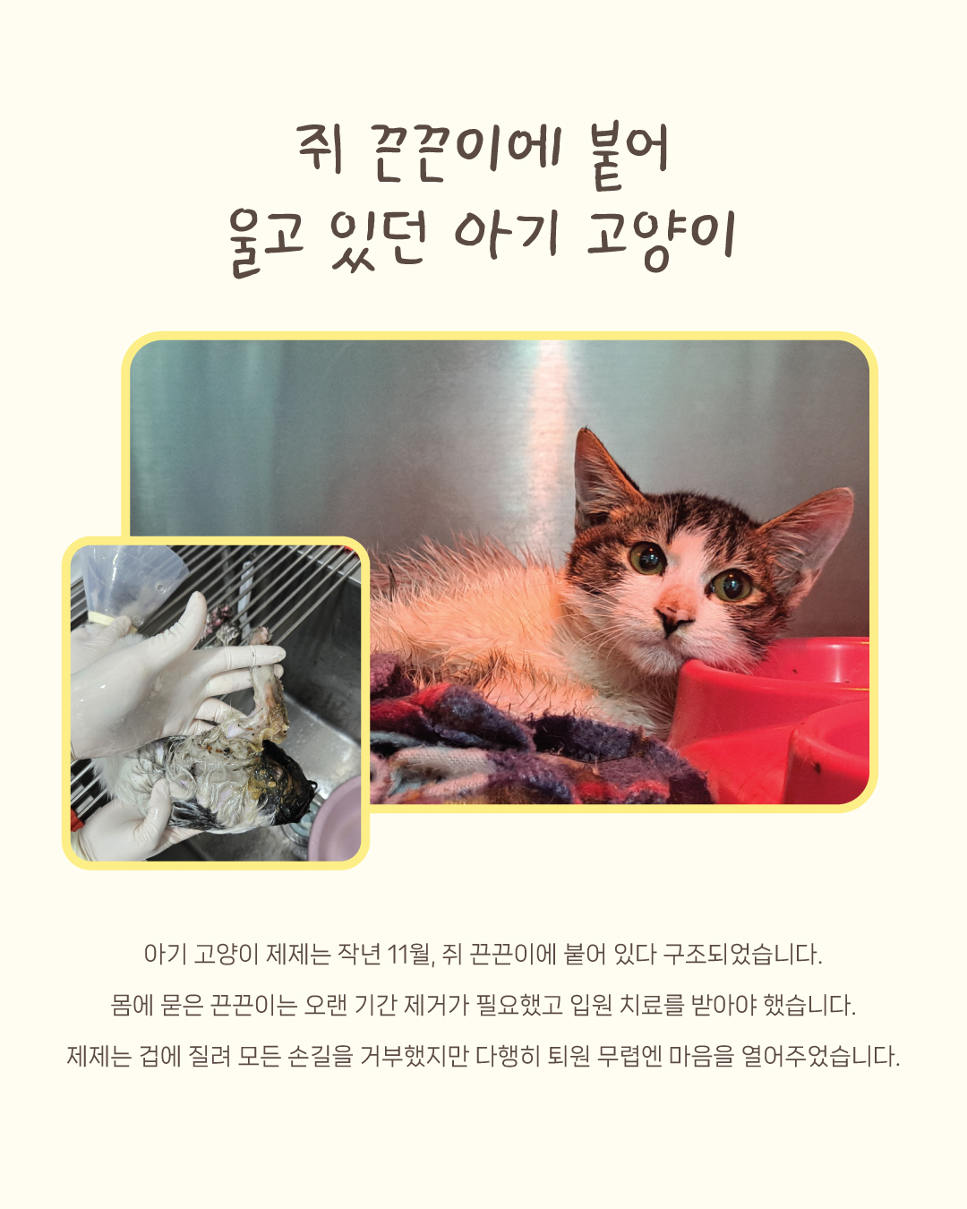 아기 고양이 제제는 쥐를 잡기 위해 설치된 끈끈이에 붙어 며칠 째 움직이지 못하고 갇혀있었습니다.