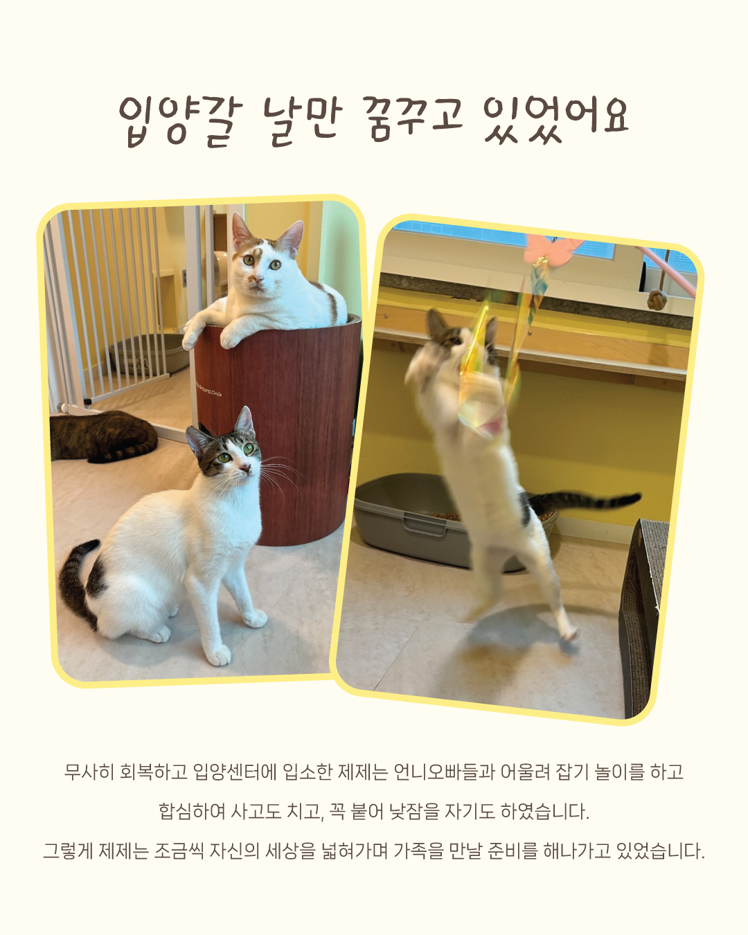 유일한 캣초딩으로 언니오빠에게 늘 먼저 장난을 치던 제제. 그런 제제를 다시 병원에 두고 와야 했기에 마음이 참 아픕니다.