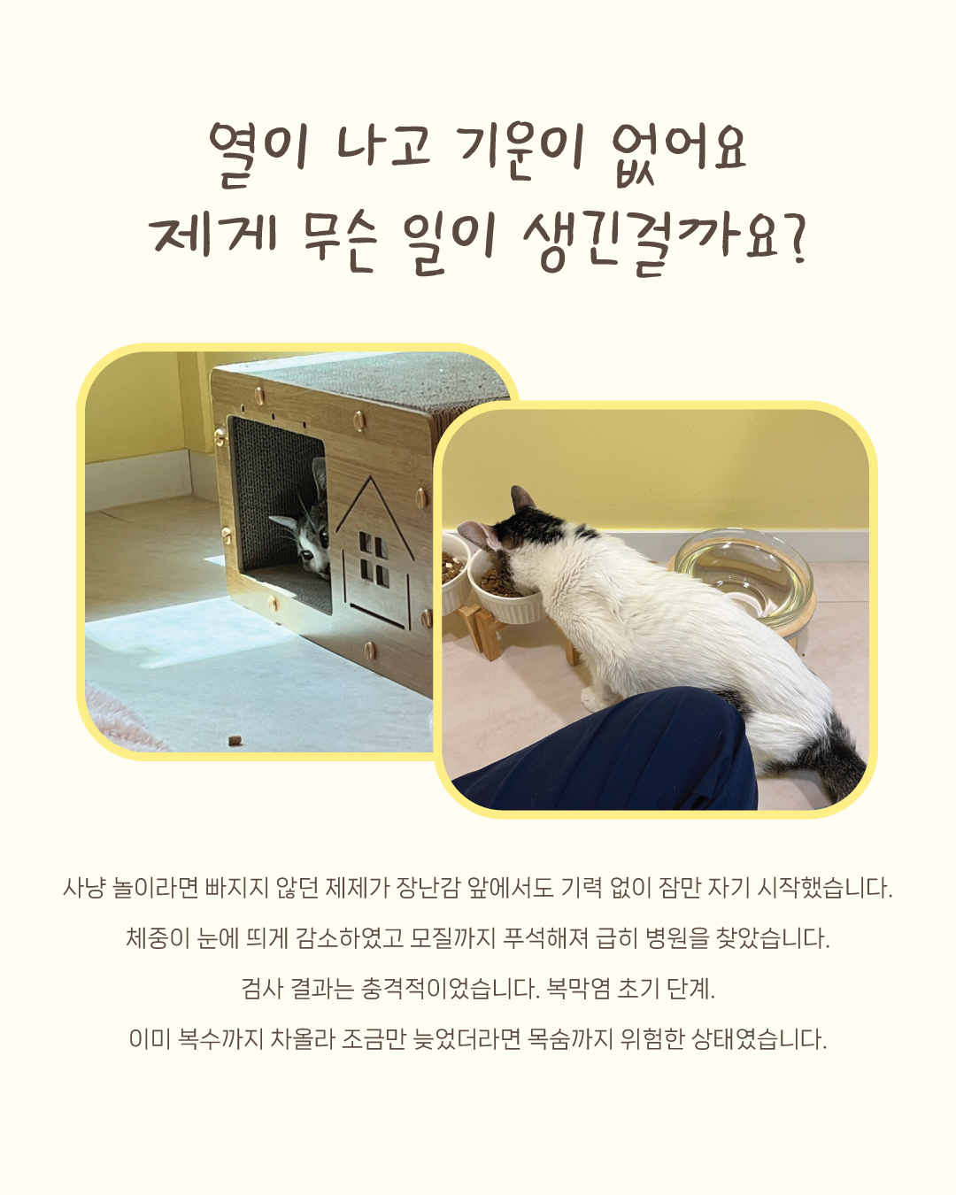 사냥 놀이라면 빠지지 않던 제제가 어느 날부터 장난감 앞에서도 기력 없이 잠만 자기 시작했습니다.