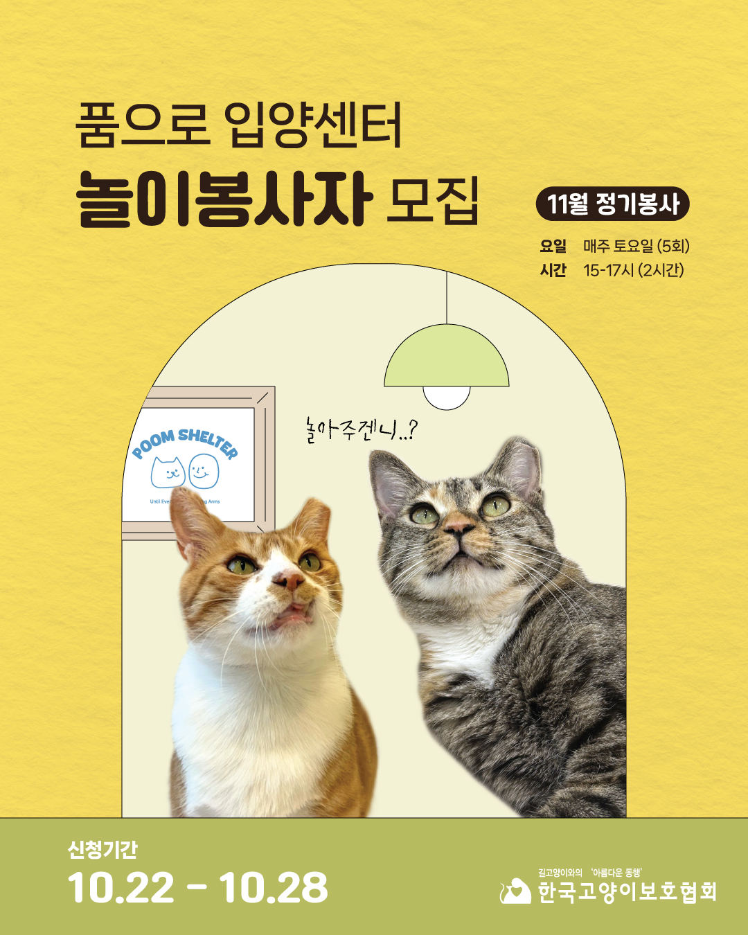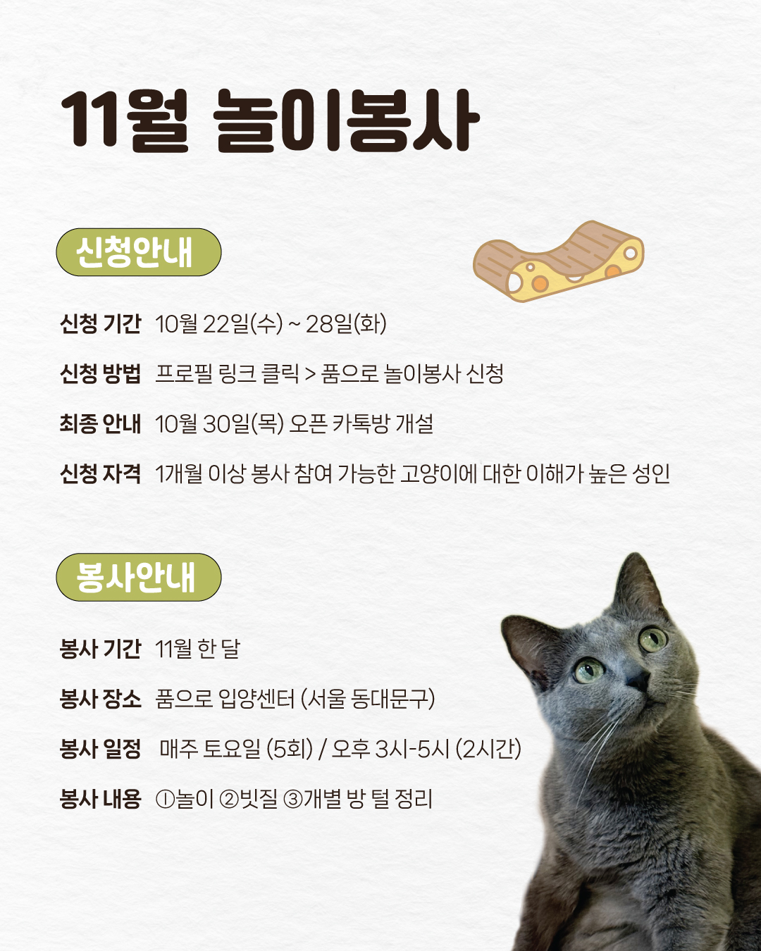 [놀이봉사자 모집] 11월 품으로 입양센터 놀이봉사자를 찾습니다