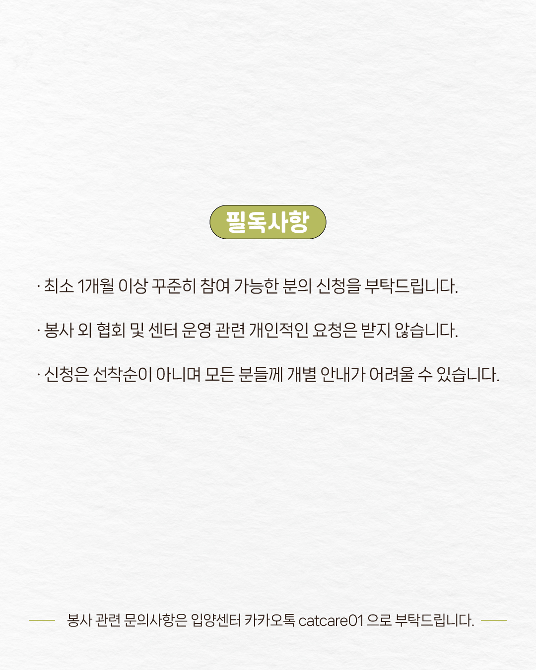 ✔상호 약속된 봉사 활동 외, 협회 및 센터 운영 관련 개인적인 요구나 요청은 진행이 어렵습니다.