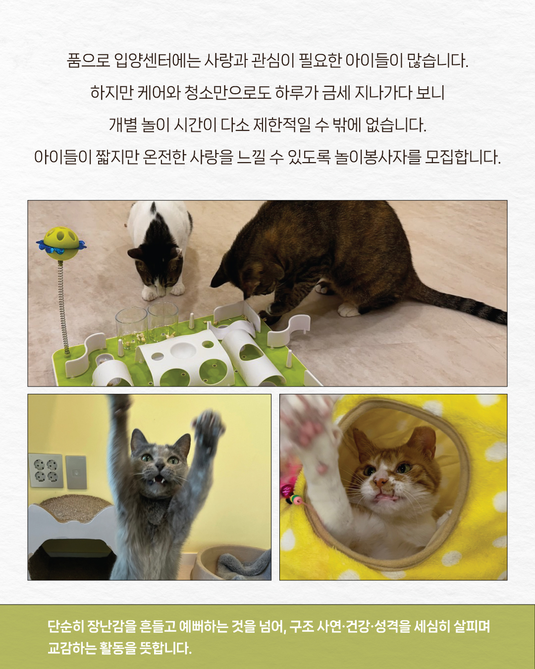 하루 종일 쓰다듬 받고 싶은 ‘달리’, 장난감을 독차지하고 싶은 ‘춘삼이’, 눈만 마주쳐도 발라당 누워 애교를 부리는 ‘튼실이’까지. 품으로 입양센터에는 유독 사랑과 관심이 필요한 아이들이 많습니다. 하지만 현실적으로 1인 1묘 전담이 어렵고, 기본 케어와 청소만으로 하루가 금세 지나가다 보니 개별 놀이 시간이 다소 제한적일 수 밖에 없었습니다.