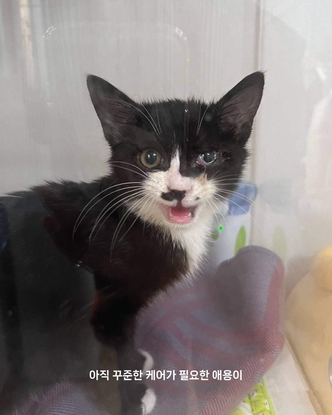 아이는 한쪽 눈은 심각한 염증으로 인해 붉게 부어 있었고, 안구가 제대로 보이지 않을 정도로 상태가 위중했습니다. 시급한 상황에 하수구 하부를 깨끗하게 정비하겠다는 약속을 하고 아이를 무사히 구조할 수 있었습니다.