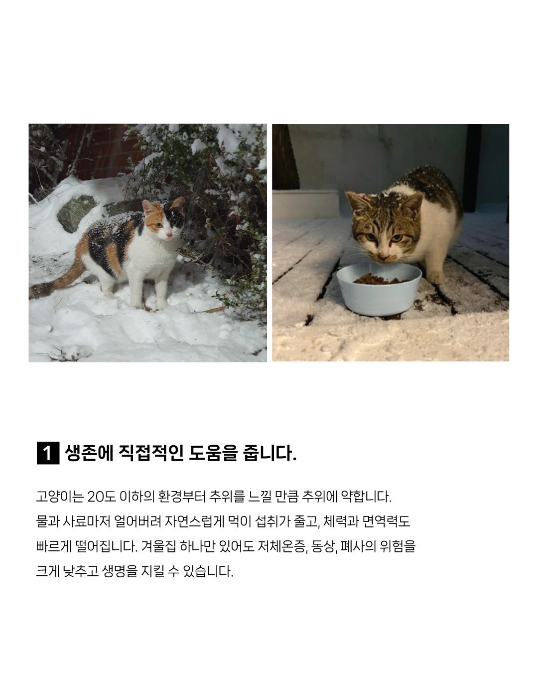 찬바람을 피할 수 있는 겨울집 하나만 있어도 저체온증, 동상, 폐사와 같은 위험을 크게 낮추고 생명을 지킬 수 있습니다.