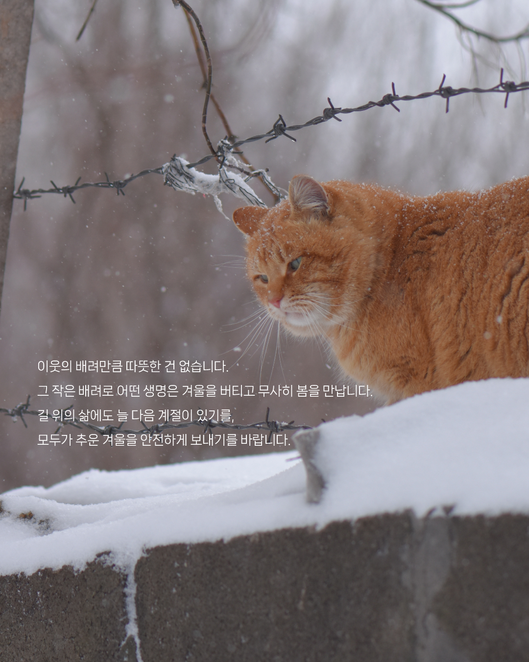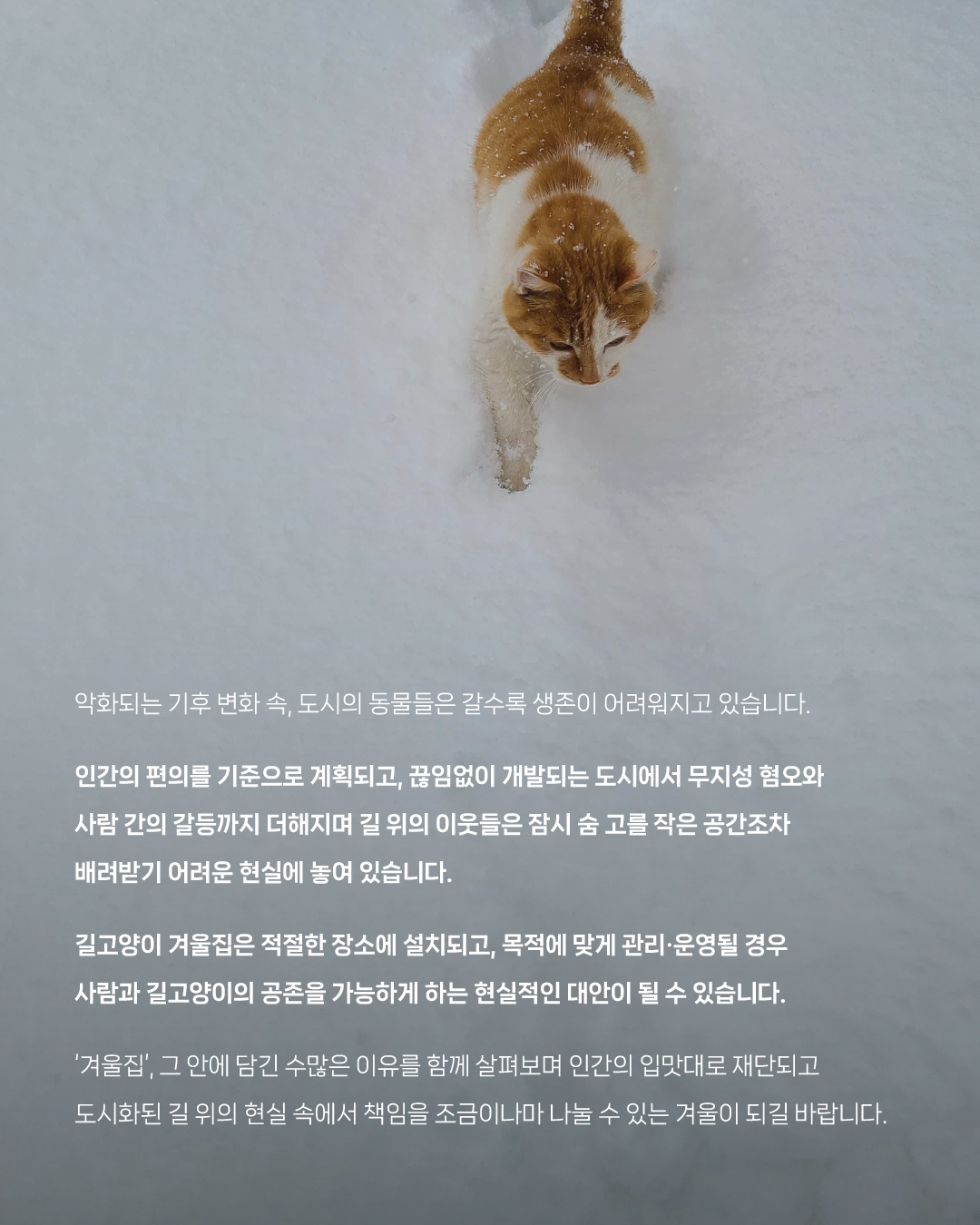 '겨울집', 그 안에 담긴 수많은 이유를 함께 살펴보며 인간의 입맛대로 재단되고 도시화된 길 위의 현실 속에서 책임을 조금이나마 나눌 수 있는 겨울이 되길 바랍니다.