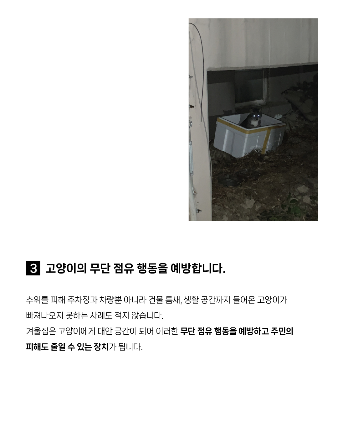 겨울집이 없을 경우 고양이들은 주차장과 차량뿐 아니라 건물 틈새나 사람의 생활 공간으로까지 들어오게 됩니다.
