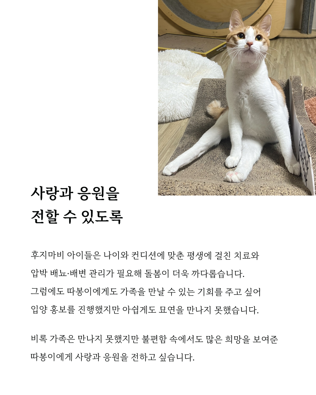 따봉이와 같은 후지마비 아이들은 나이와 컨디션에 맞춘 평생에 걸친 치료와 압박 배뇨·배변 관리가 필요해 돌봄이 더욱 까다롭습니다. 그럼에도 따봉이에게도 가족을 만날 수 있는 기회를 주고 싶어 입양 홍보를 진행했지만 아쉽게도 묘연을 만나지 못했습니다. 불편함 속에서도 많은 희망을 보여준 따봉이에게 사랑과 응원을 전하고 싶습니다.
