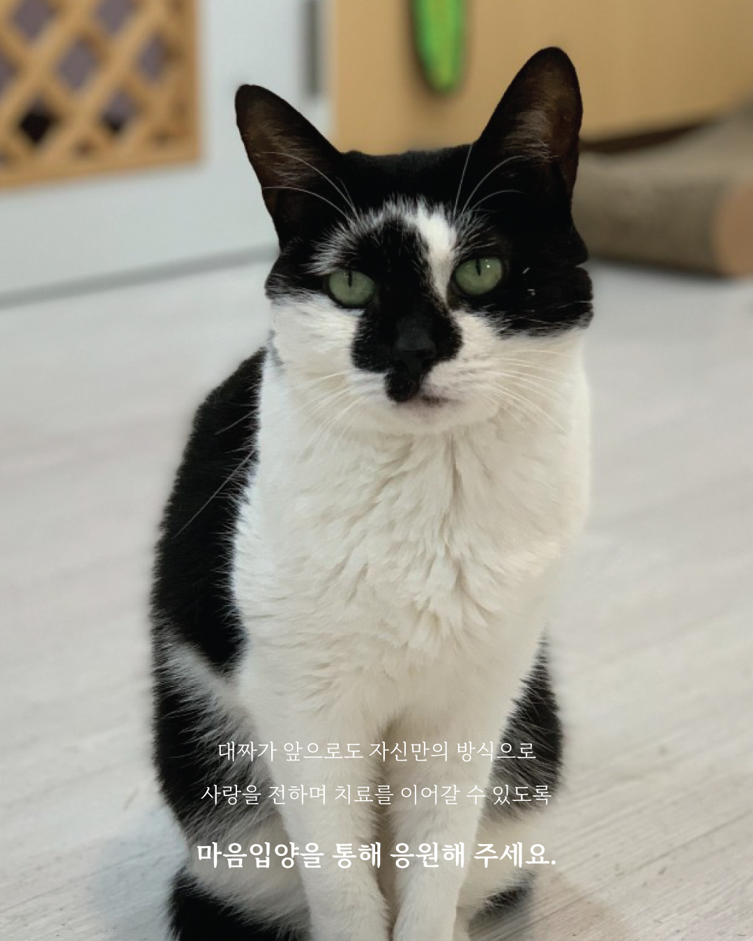 어쩌면 대짜의 삶이 산 넘어 산, 고비 넘어 고비처럼 보일지도 모릅니다. 하지만 대짜는 그저 조용히 자신의 하루를 살아가며 작은 용기를 보여주고 있습니다. 오늘도 대짜는 친구들에게 머리를 부비고, 입소 때부터 함께해 온 케어매니저의 발밑에 조심히 다가와 자신이 할 수 있는 사랑을 전합니다.