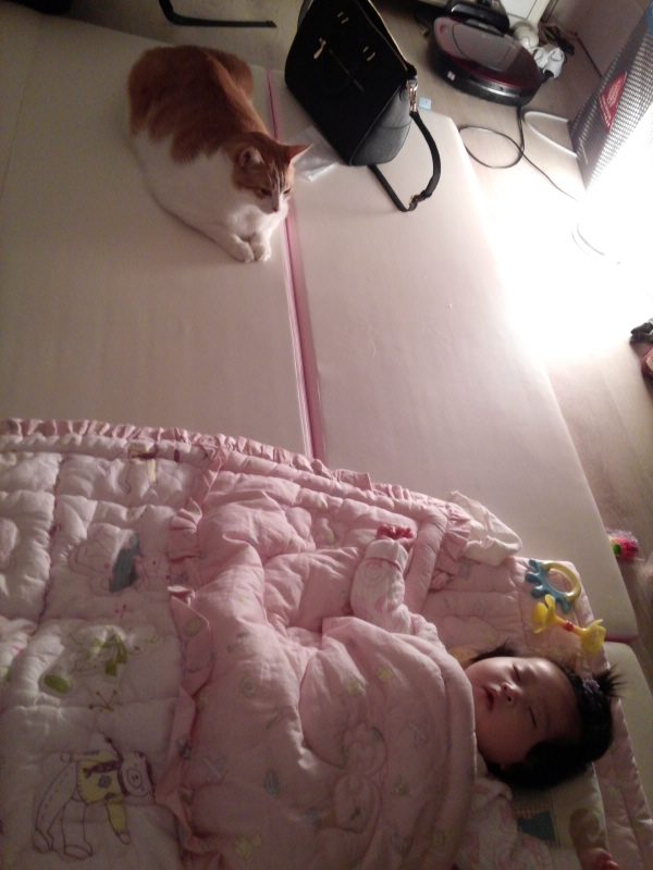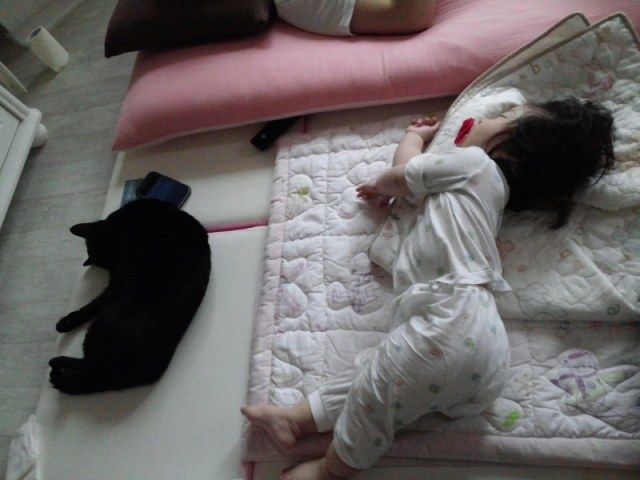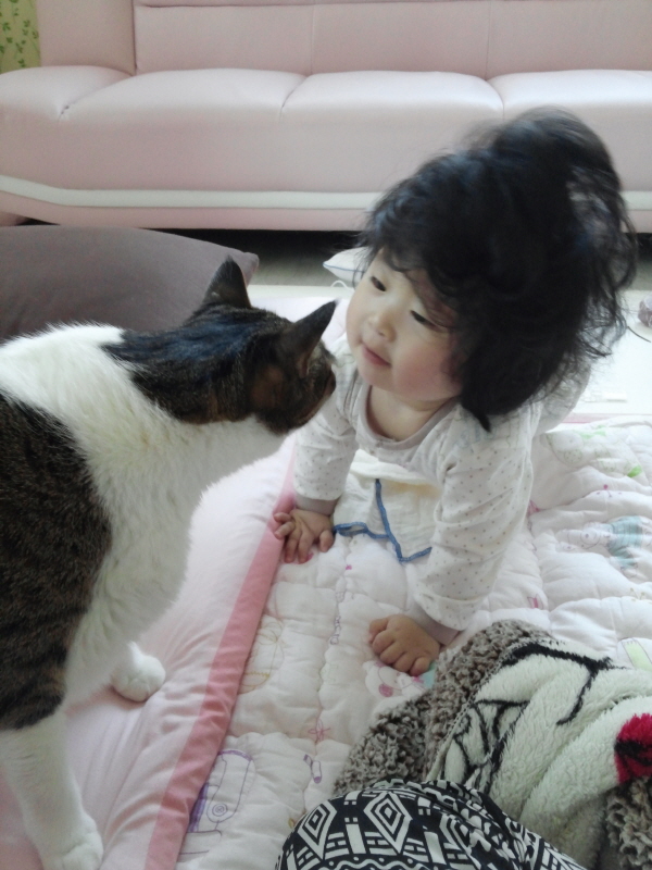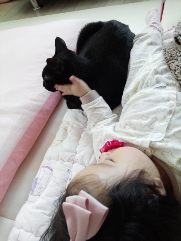아래는 2주가 지난 이후부터 냥이들과 딸래미가 함께 지내는 일상의 모습들입니다.