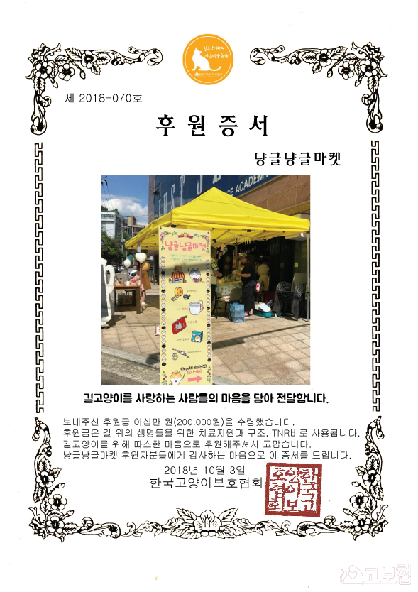 고양이를 좋아하는 사람들을 위한 사랑스러운 고양이 핸드메이드 냥글냥글마켓에서 한국고양이보호협회로 200,000원을 후원해주셨습니다. 많은 분들이 좋은 취지에 동참해주셔서 감사드리며, 길고양이들의 더 나은 삶을 위해 마음써주신 냥글냥글마켓 께 정말 감사드립니다.보내주신 후원금은 길 위의 아이들을 위해 꼭 필요한 곳에 소중히 투명하게 사용하겠습니다. 따뜻한 마음으로 후원해주셔서 정말 감사드려요.