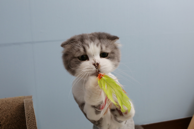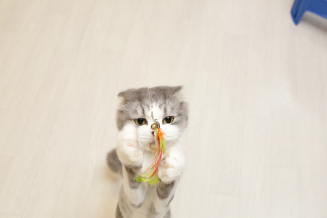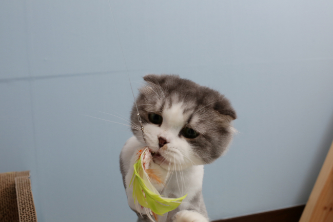 귀여운 코뽀뽀로 발 만지작의 아쉬움을 뒤로하고 선반에서 내려와줄 장난감 미끼를 가져옵니다~