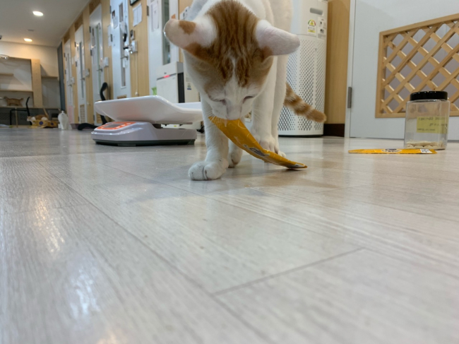 간식에 초 집중하는 모습이 담긴 사진이랍니다.