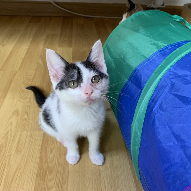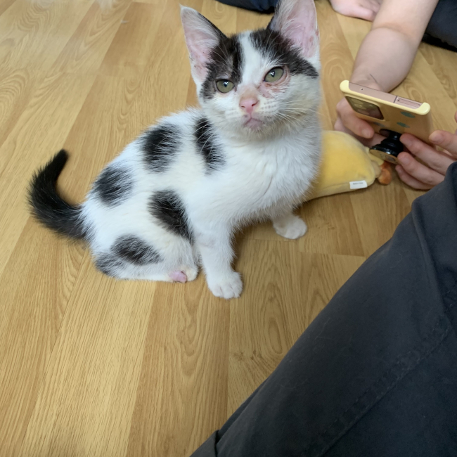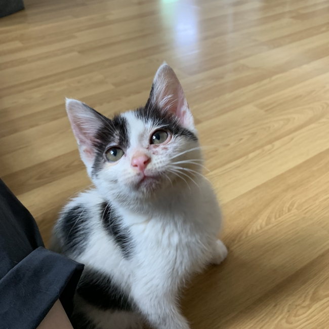 다시 사람겿에 붙어있는 콩잎이 약간 츤츤한 느낌의 사람 좋아 근데 사람 귀찮아 느낌이 강한 아기고양입니다.