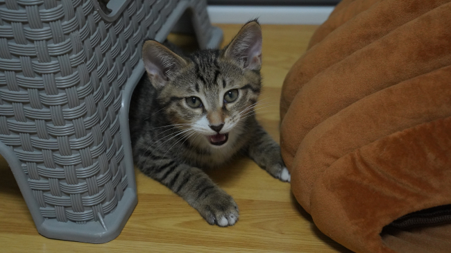 긴장이 풀리는지 얼굴부터 빼꼼 나와 천천히 움직이며 놀기 시작하는 아깽이입니다.