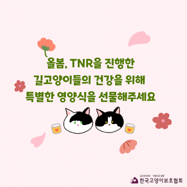 따뜻한 봄은 길고양이들이 TNR수술을 받기에 가장 적합한 계절로, 올해에도 협회에서 진행하는 꽃냥이TNR캠페인을 통해 많은 길고양이들이 보다 건강한 묘생을 위해 TNR수술을 받고 있습니다.