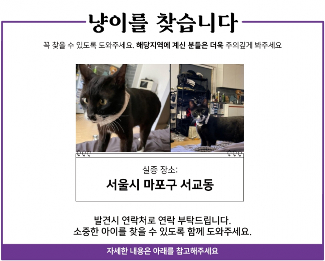해당 지역에서 활동하시는 캣맘/캣대디 회원님들은 이 아이를 발견하시면 해당 번호로 많은 제보를 부탁드립니다.