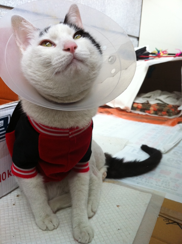 머리에 깔데기 같은건 어제 너무 답답해 보여서 빼줬더니 상처 부위를 너무 핥아서 빨갛게 되었더라구요