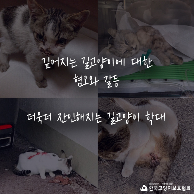 길고양이들에 대한 학대사건이 끊이지 않고 있습니다. 매해 이슈화되는 길고양이 학대 뿐 아니라 관심을 덜 받거나 주목받지 못하는 학대 사건들까지 우리들이 알게 모르게 계속 일어나고 있습니다. 해가 지날수록 길고양이에 대한 혐오의 골이 깊어지며 ‘캣맘충’ ‘털바퀴’라는 단어를 만들어져 특정 대상을 비하하고 학대 방법과 수단 또한 더욱더 잔인해지고 있는 상황입니다.