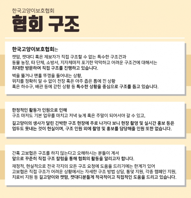 사진과 영상을 촬영해 남겨주시고 구조에 적극적으로 참여해주셔야 아이들의 구조를 도울 수가 있고 구조를 위한 시간을 단축할 수 있습니다. 협회는 타단체처럼 상근구조팀이 따로 없으나 협회에서 할 수 있는 최대한의 구조에 있어서 도움을 드리기 위해 노력하고 있습니다. 부디 협회와 함께 구조에 적극적으로 나서주시면 감사하겠습니다.