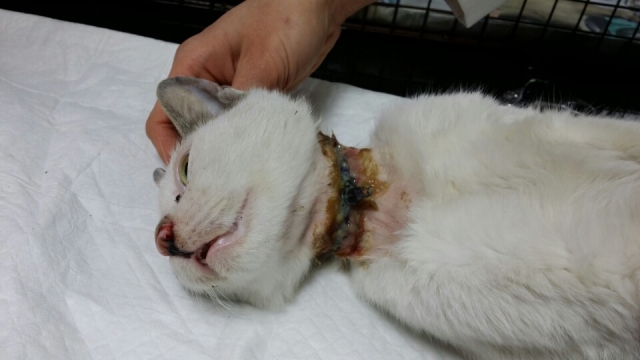 목이 조여 상처가 깊은 냥이 구조하였습니다