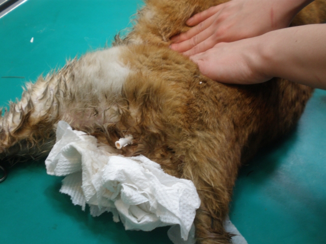 나중에 안 사실이지만 엎드린 채 움직이지 못하는 상황에서 소변이 새 나와 복부와 네 발, 꼬리까지 젖은 것이었습니다.