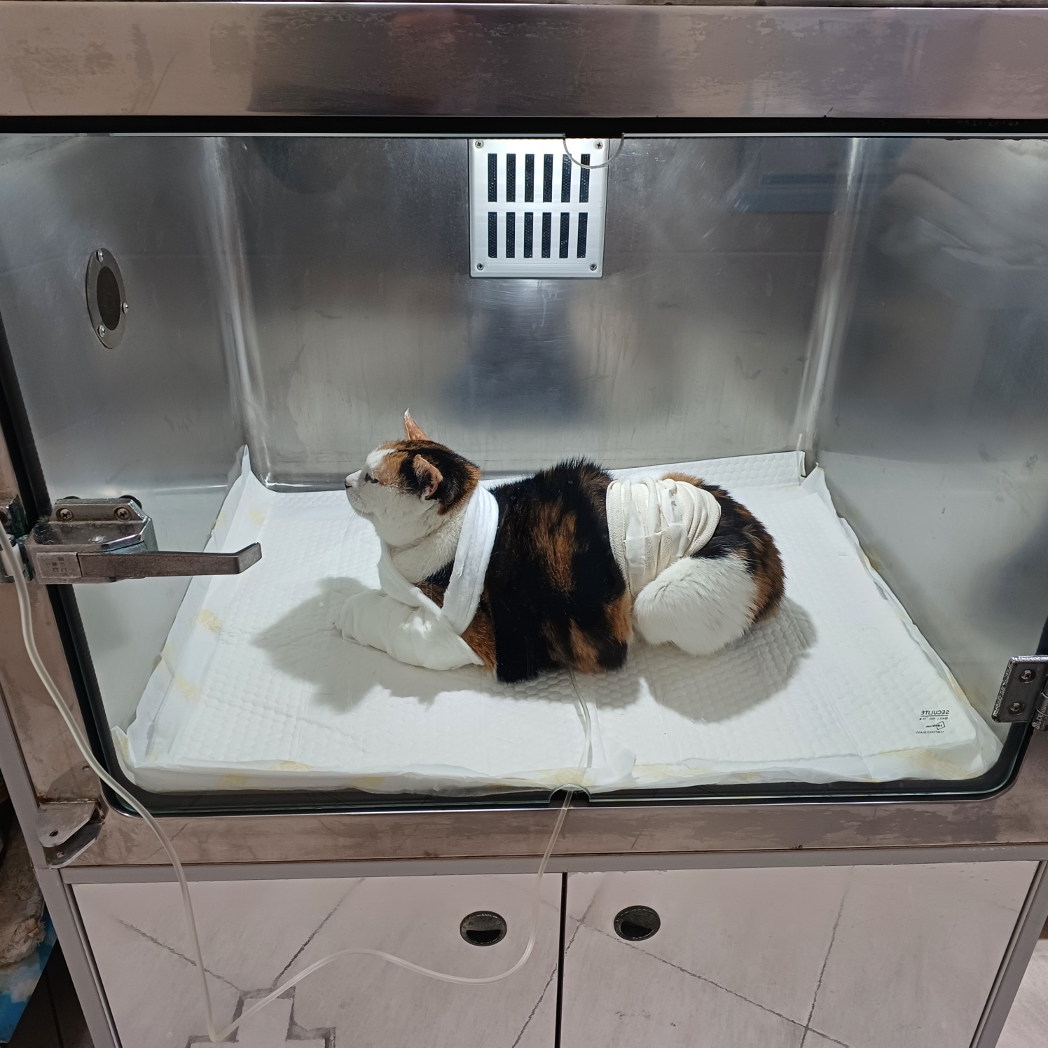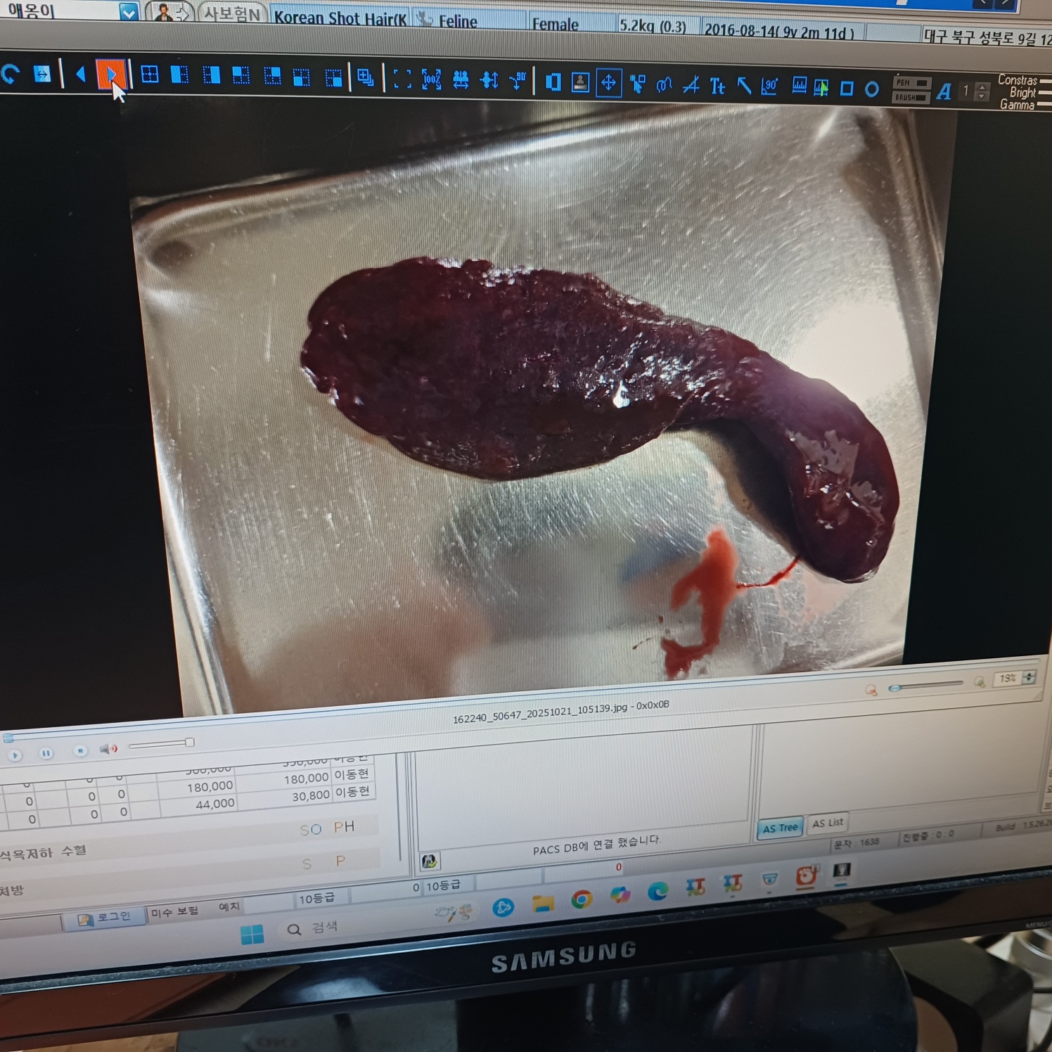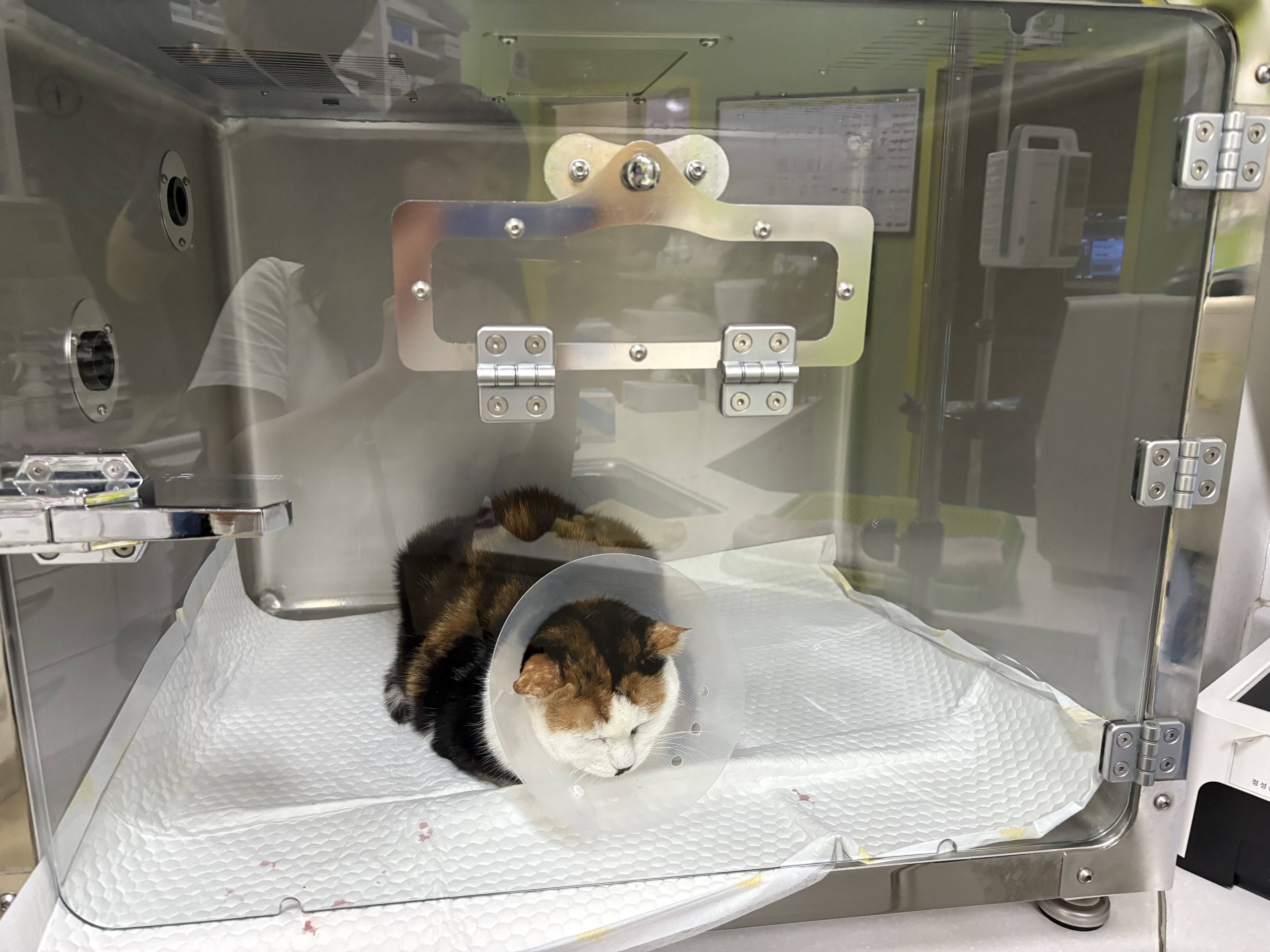 치료과정 병원에 내원해 아이의 증상을 설명하니 여러 질병의 가능성이 있다고 하셨습니다. 의사 선생님은 잇몸이 눈에 띄게 창백해 빈혈이 의심된다며, 식욕 저하의 원인을 정확히 확인하기 위해 초음파와 혈액검사를 함께 진행하자고 제안하셨습니다. 먼저 초음파를 실시한 결과, 비장의 크기가 비정상적으로 커져 있고 형태도 고르지 않아 비장 종양으로 진단되었습니다. 의사 선생님께서는 수술이 시급하다고 판단하셔서 고보협 승인을 받은 뒤 곧바로 수술 일정을 잡았습니다. 수술 당일에는 정밀 초음파와 혈액검사를 다시 진행했는데, 예상대로 빈혈 수치가 매우 낮아 응급 수혈이 필요하다는 설명을 들었습니다. 다행히 함께 키우는 고양이의 혈액형이 일치해 빠르게 수혈을 진행할 수 있었고, 이후 종양 제거 수술을 무사히 마쳤습니다. 적출된 비장은 외부에 조직검사를 의뢰하였으며, 다음 날 아이의 회복이 빨라 퇴원했습니다. 집에서는 처방된 약을 복용시키며 세심히 케어했고, 3일 뒤 재내원하여 경과 확인과 추가 약 처방을 받았습니다. 일주일 뒤(11.01) 다시 내원해 실밥을 제거하며 검사 결과를 확인했는데, 다행히 종양은 악성이 아니었고, 당분간 약을 꾸준히 복용하며 면역 관리에 신경 쓰면 된다는 소견을 받았습니다.