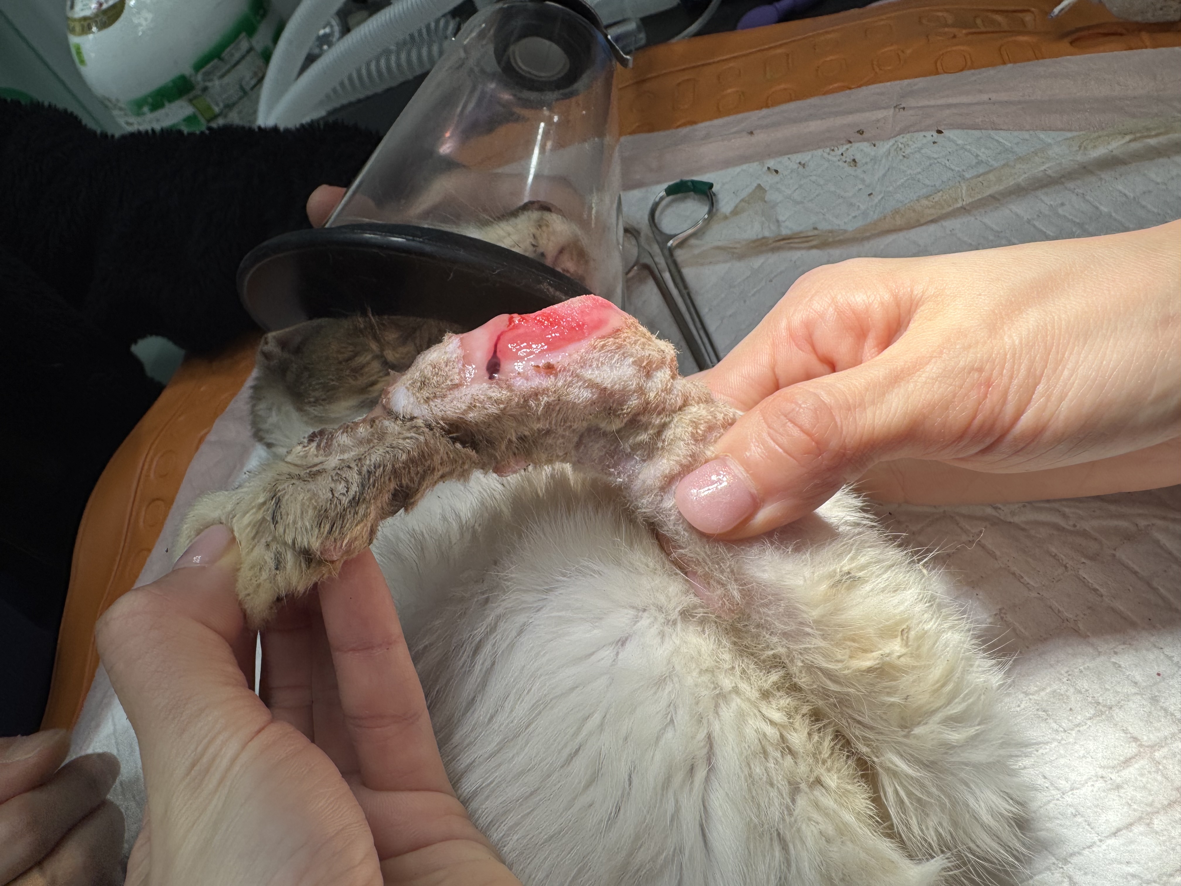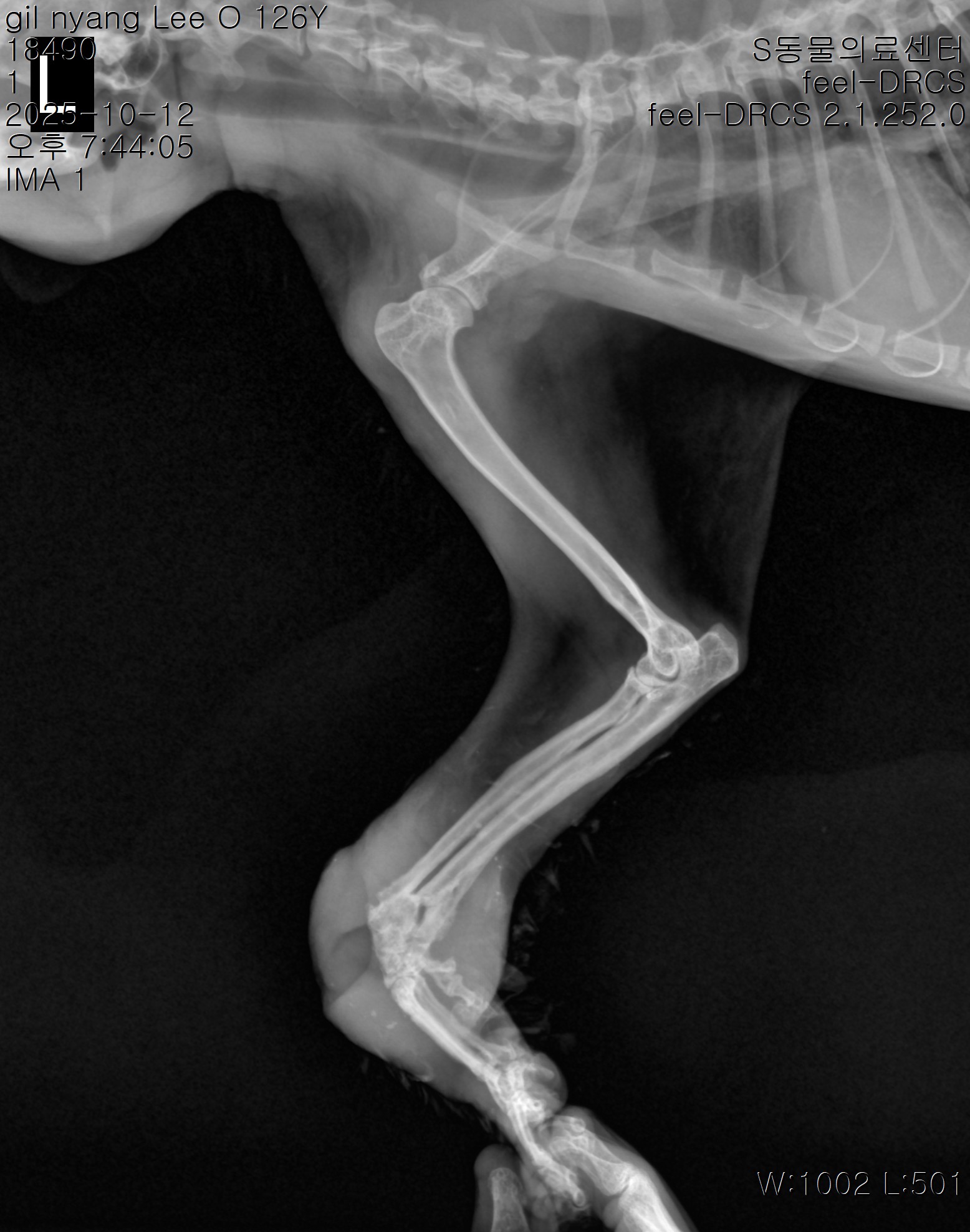 | 치료과정 | 다리골절이 상당히 이전에 진행되어 그 상태로 자연유합 된 채로 굳었다고 했습니다. 그리고 그이후 상처가 난 곳이 아물지 않고 염증성조직으로 바뀌어서 꿰맨다고 해도 그 살들이 붙을 수 없는 상태라고 했습니다. 눈으로 봐도 살이 부어오른 부분이 빨갛고 꽤 두꺼웠어요. 그래서 절단을 해야하는데 팔꿈치를 남긴다고 해도 다니면서 부딛히거나 걸리거나 하면 또 염증발생위험이 있어 어깨까지 자르는 것이 좋다는 소견을 받았습니다. 빈혈수치도 좋지 않고 구내염 소견도 있었으나 이빨 상태는 꽤 좋은편이라 복용약 먹으면서 관리해보기로 하고, 수술은 바로 진행보다는 적응기를 두고 빈혈수치도 보면서 하는 것이 좋겠다고 했습니다. 그리고 중성화 수술도 안되어 있어서 중성화수술도 함께 진행했습니다. 나이가 있어보였는데 이빨을 보면 그렇게 많은 나이는 아니라고 하더라고요ㅠ 다행이 수술전 수술후 밥도 잘먹고 하악질은 했으나 성격은 순둥한 편이라 수술을 잘 마쳤습니다. 그리고 빈혈수치도 나중에 좋아졌습니다. 상처난채로 길에서 지낸지 오래되서 빈혈수치도 안좋아진것같다고 했습니다. |