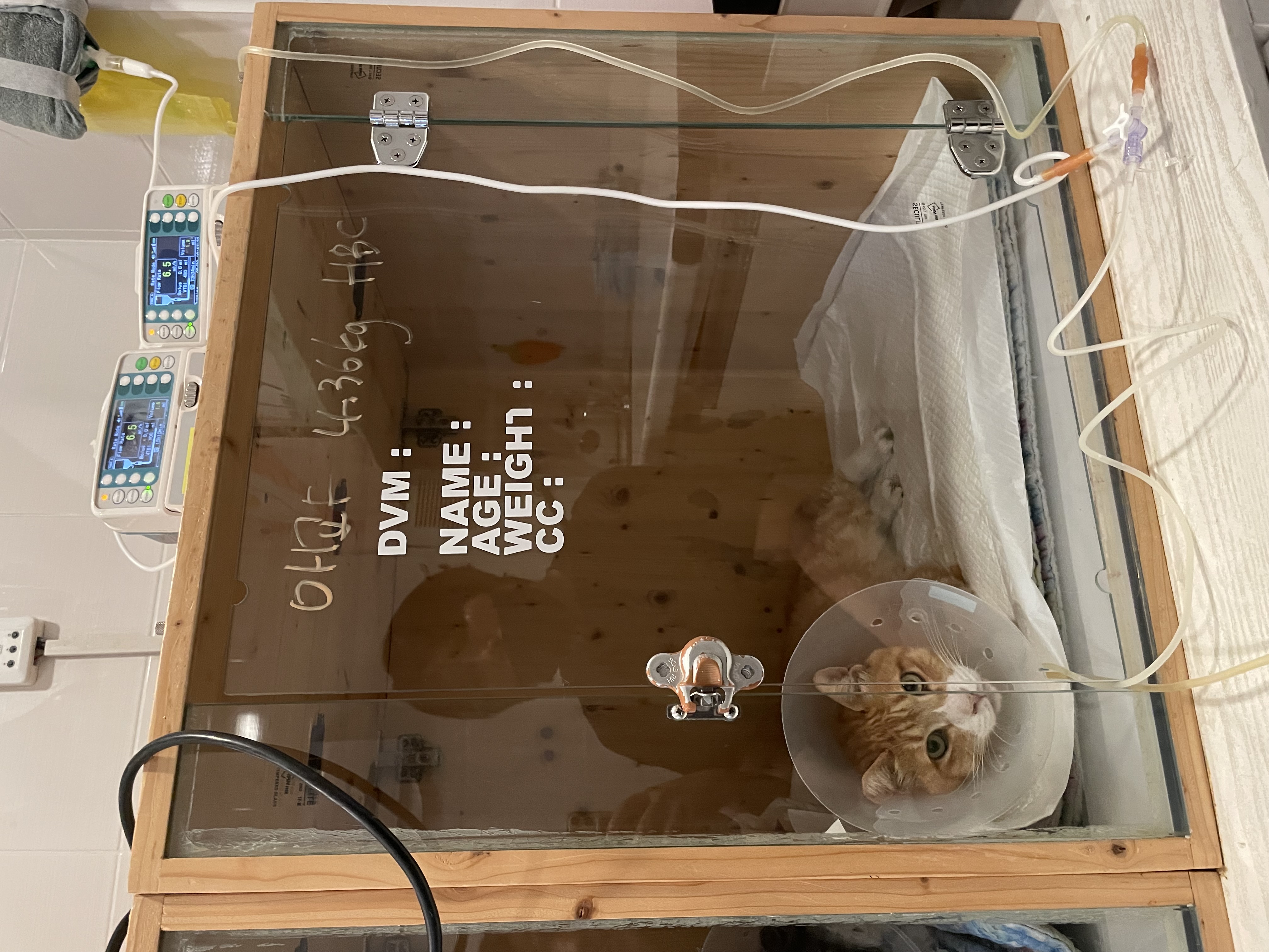 뇨카테타를 뺄 수가 없었으며 퇴원을 3주정도 있다가 생각했는데 빈혈수치가 계속해서 떨어져 수혈을 4차까지 진행하였으며 줄기세포주사치료를 7회 진행하였으나 다른 고양이들에비해 애교에게는 전혀 효과가 없었습니다. 입원이 점점 길어지기 시작했으며 병원측에서도 조금만 더 지켜보자고하여 영양수액과 기타치료가 계속 들어갔습니다. 면회를 갈때마다 밥을 조금씩 먹어줬지만 평소에는 먹지않아 병원에서 스트레스를 많이받아서 그런가 싶어 천장골 골절 수술은 잘 됐기때문에 집으로 데려가 기존 지내던 곳에서 케어를 하면 수치가 오를까 싶어 10/25 퇴원을 해서 집에서 케어하기로 하였으나 집에와서도 잘 못먹고 오줌 또한 잘 싸지 못하였으며 이틀차에 오줌을 엄청싸고나서 몸이 처지면서 뻗어버렸습니다. 열이나기 시작해 동네병원가서 해열주사를 처방받고 수액을 맞췄으나 기력을 찾지못해 다음날 다시 창원병원으로 데리고갔습니다. 다시 입원을 권유받았고 애교 상태가 많이 안좋아서 원장님께서 마지막으로 수혈 진행하고 빈혈수치가 올라오지 못하면 더이상 치료가 어렵다고 하였습니다. 다행히 수혈 후 수치가 좀 올라서 병원에 입원하여 경과를 지켜보는중 안타깝게도 요도폐색이 진행되어 응급수술을 하게되었습니다. 수술후에도 줄기세포와 수혈을 진행하였으나 며칠 정도 괜찮다가 다시 몸이 안좋아지기 시작하였습니다. 그러다 애교가 동공이 풀리며 산소호흡기를 차게되었습니다. 결국 병원원장님이 애교가 할 수있는 시술은 다 했으며 더이상 치료가 불가하다고 판단하여 집에 데리고와 이틀 후 고양이 별에 가게 되었습니다.