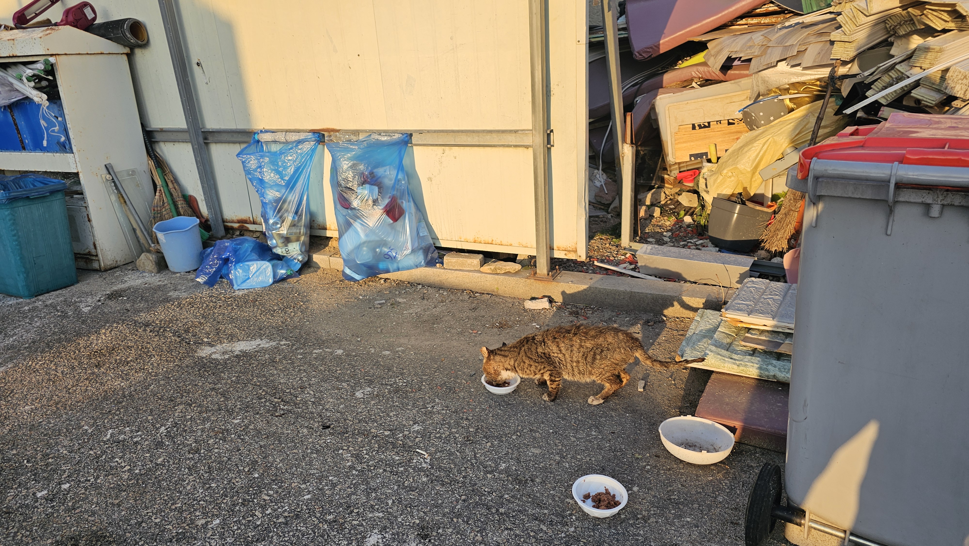 | 치료완료후 케어계획 | 11월 18일 퇴원 후 장수가 원래 지내던 요양병원 밥자리에 방사를 진행했습니다. 방사 후 놀라거나 멀리 도망가지 않고 다행히 제 옆을 맴맴 돌아서 한시름 놓고 밥을 주었는데 그 다음날 장수가 보이지 않아 멘붕.. 다행스럽게도 그 다음날 모습을 보인 이후로는 어디 가지않고 항상 제가 오면 가장 먼저 나와서 밥을 달라고 조릅니다. 피가 섞인 침을 흘리던 이전 모습과는 달리 침 흘리는 것도 완벽히 줄어들었고, 그러다보니 얼굴 주변이 제법 보송해져서 매일 볼 때마다 깜짝 놀랍니다. 늘 고통에 찬 비명을 질렀는데, 이제는 밥달라고 애옹 대고 밥도 흘리는 거 없이 너무 잘 먹어서 볼 때마다 기분이 너무 좋습니다. 매일 제가 밥자리에 가서 사료와 깨끗한 물은 물론, 당분간 장수는 약을 먹기 때문에 습식에 약을 타서 아침 저녁으로 먹이는 중입니다. |