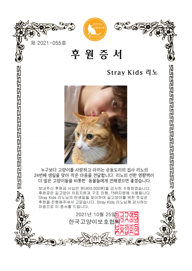 #Stray Kids #리노 #981025 #24번째 생일 #진심으로 #축하드립니다 #리노님의 #선한 영향력 #길고양이를 위한 #기부 #감사합니다