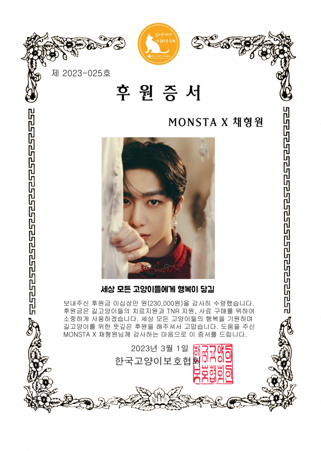 #MONSTA X #채형원 #길고양이를 #위한 #특별한 #기념후원 #MONSTA X #채형원님께서 #보내주신 #후원금은 #길고양이들을 #위해 #감사히 #사용하겠습니다 #세상 #모든 #고양이들의 #행복을 #기원해주시며 #큰 #도움주셔서 #감사합니다