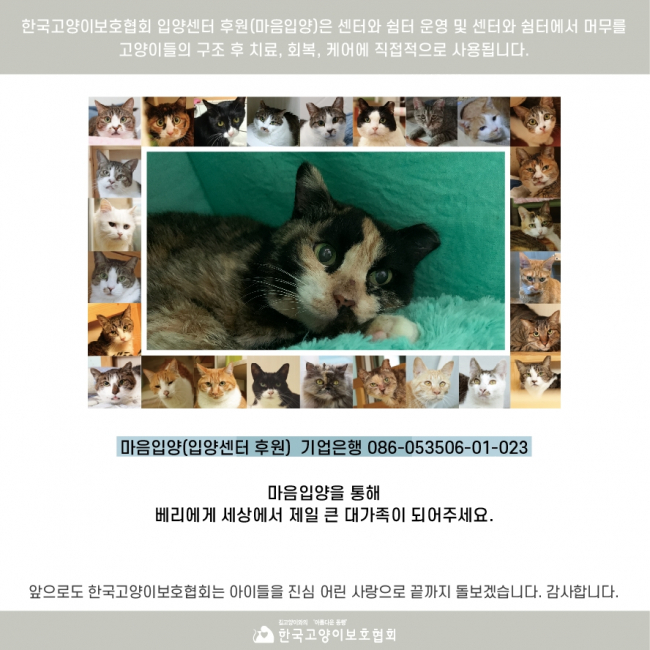 보내주신 입양센터후원(마음입양) 덕분에 베리의 치료에 보다 매진할 수 있었습니다.
