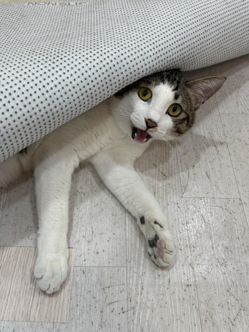누군가 러그 밑에 숨어 있어요.