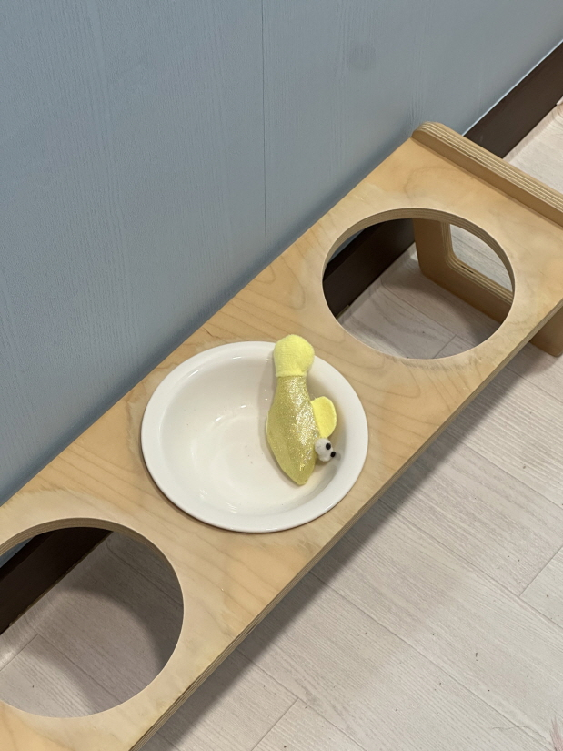 그리고 요즘 밥그릇에 좋아하는 물고기 장난감을 올려놓는 귀여운 습관도 생겼어요.