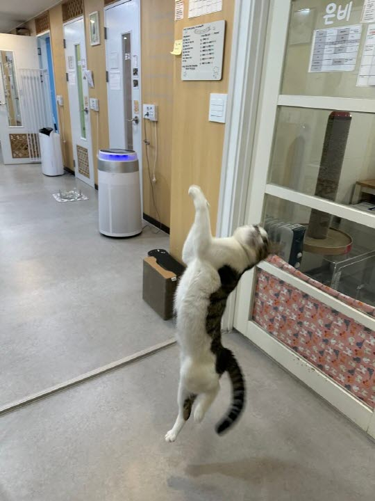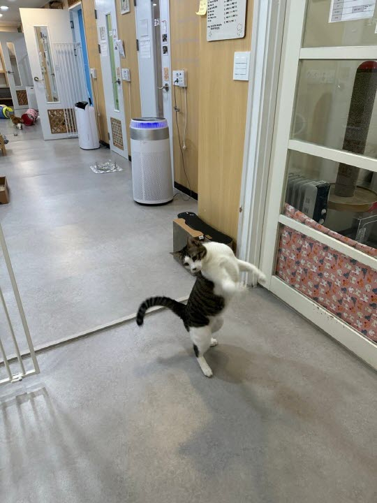 복도에서 다른 냥이들을 놀아줄 때 소리가 나면 문 앞에서 울며 같이 놀아달라고 부르는,