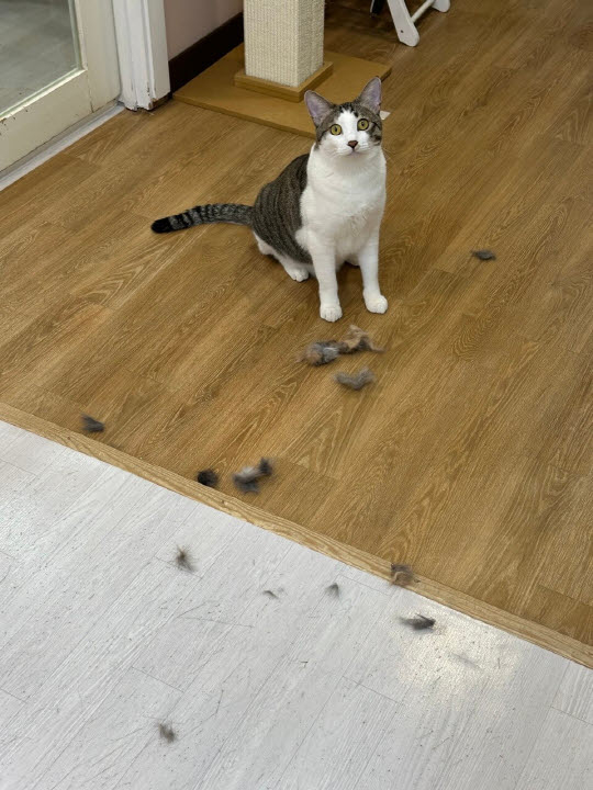 장난감 망가뜨리기의 자매품으로는 빗질해서 모아놓은 털공 흩어놓기도 있어요.