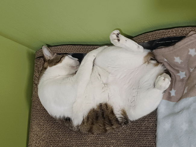 치봉이는 전에는 주로 스크래쳐나 매트 위에서 약간 어정쩡하게 일어나는 편이었는데