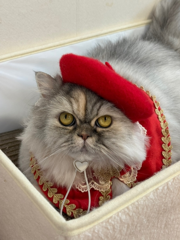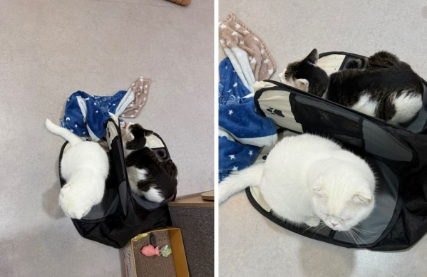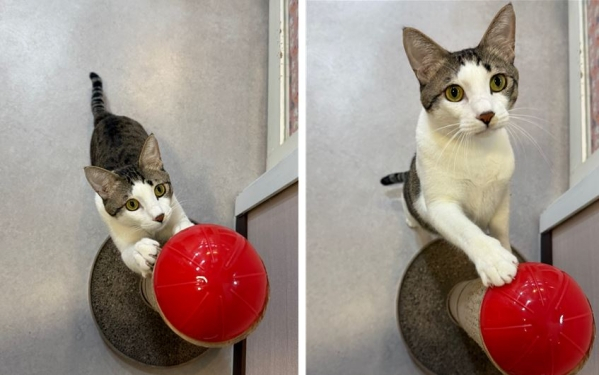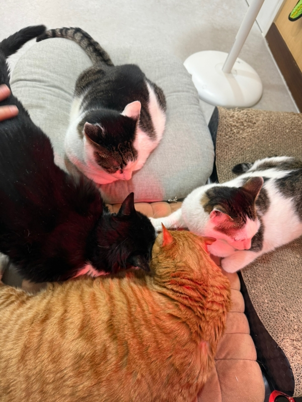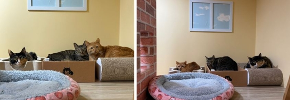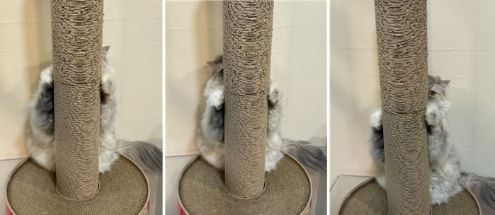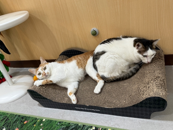 까까가 저 소파형 스크래처를 좋아해서 치봉이 위로 자리잡은 모습입니다!