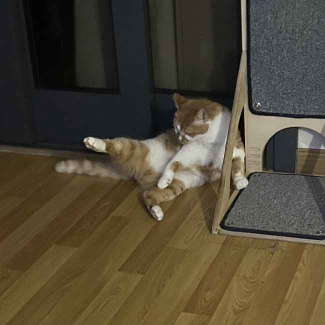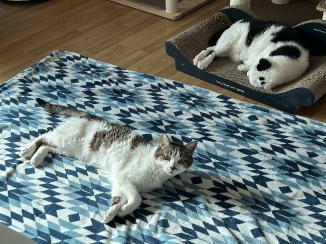 앞다리를 쭉~ 뻗는 시원한 스트레칭 자세를 아주 좋아해요.