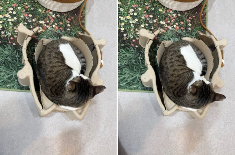 구미보다 덩치가 더 커진 천재도 이 종이방석을 좋아해서 테두리가 더 벌어졌어요.