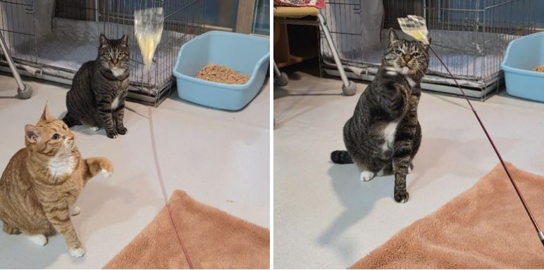 우리 쉼터 친구들은 망가진 낚시대에 테이프를 칭칭 감아놓은 장난감을 아주 좋아합니다.