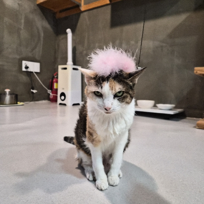 삐용이는 장난감에 관심이 없으니 머리에 살포시 얹어 보았습니다.