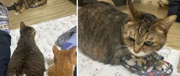 사람좋아 고양이단의 요즘 최애 놀이: 활동가 다리사이에 앉아있다 슬리퍼 뺏기