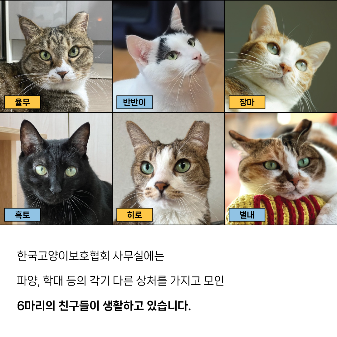 한국고양이보호협회 사무실에는 파양, 학대 등의 사연을 가지고 모인 6마리의 친구들이 생활하고 있습니다.