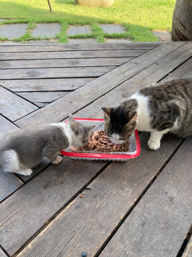 한 쪽엔 어미를 위해 원래 저희가 주던 성묘용 사료를 주었고 한 쪽엔 새끼를 위해 선물로 받은 사료를 주었습니다.